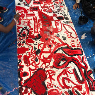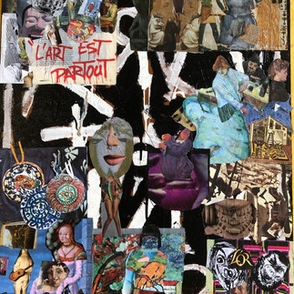 Sur toiles, deux oeuvres collectives mêlant des techniques très divers: collages, peinture, graphisme, découpage...etc. et reprise de slogans ou de travaux réalisés antérieurement en classe.